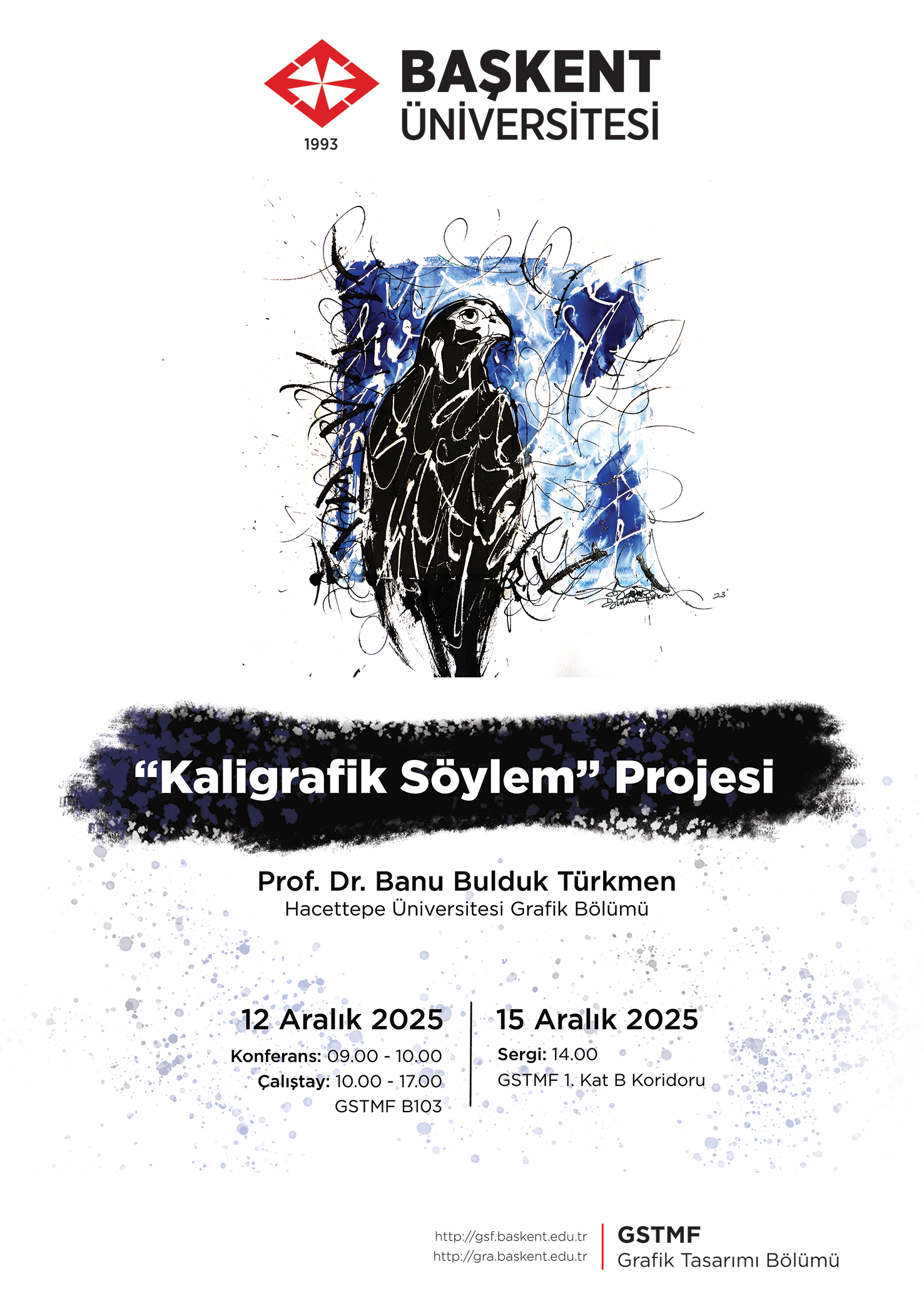12 Aralık Cuma günü, Prof. Dr. Banu Bulduk Türkmen'in katılımıyla "Kaligrafik Söylem" projemiz saat 09.00'da konferans ve saat 10.00'da çalıştay ile B103 numaralı derslikte gerçekleşecektir ve 15 Aralık Pazartesi günü saat 14.00'da projemizin sergisi GSTMF 1. Kat B Koridorunda açılacaktır.