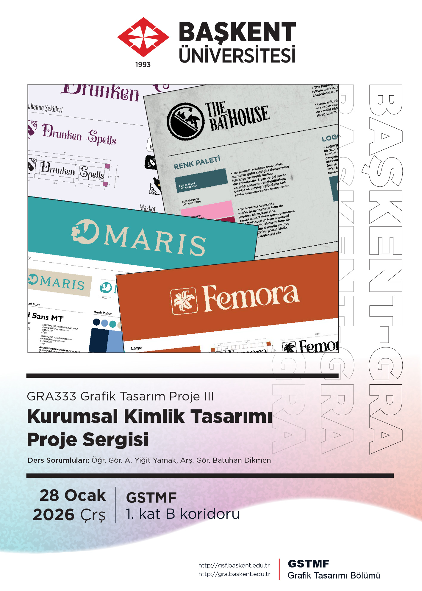 GRA333 Grafik Tasarım Proje III dersimizin Kurumsal Kimlik Tasarımı temalı 2025-2026 Güz Dönemi Dönem Sonu Sergisi; 28 Ocak Çarşamba tarihinde Başkent Üniversitesi Güzel Sanatlar, Tasarım ve Mimarlık Fakültesi B Koridoru, 1. Katta açılacaktır.